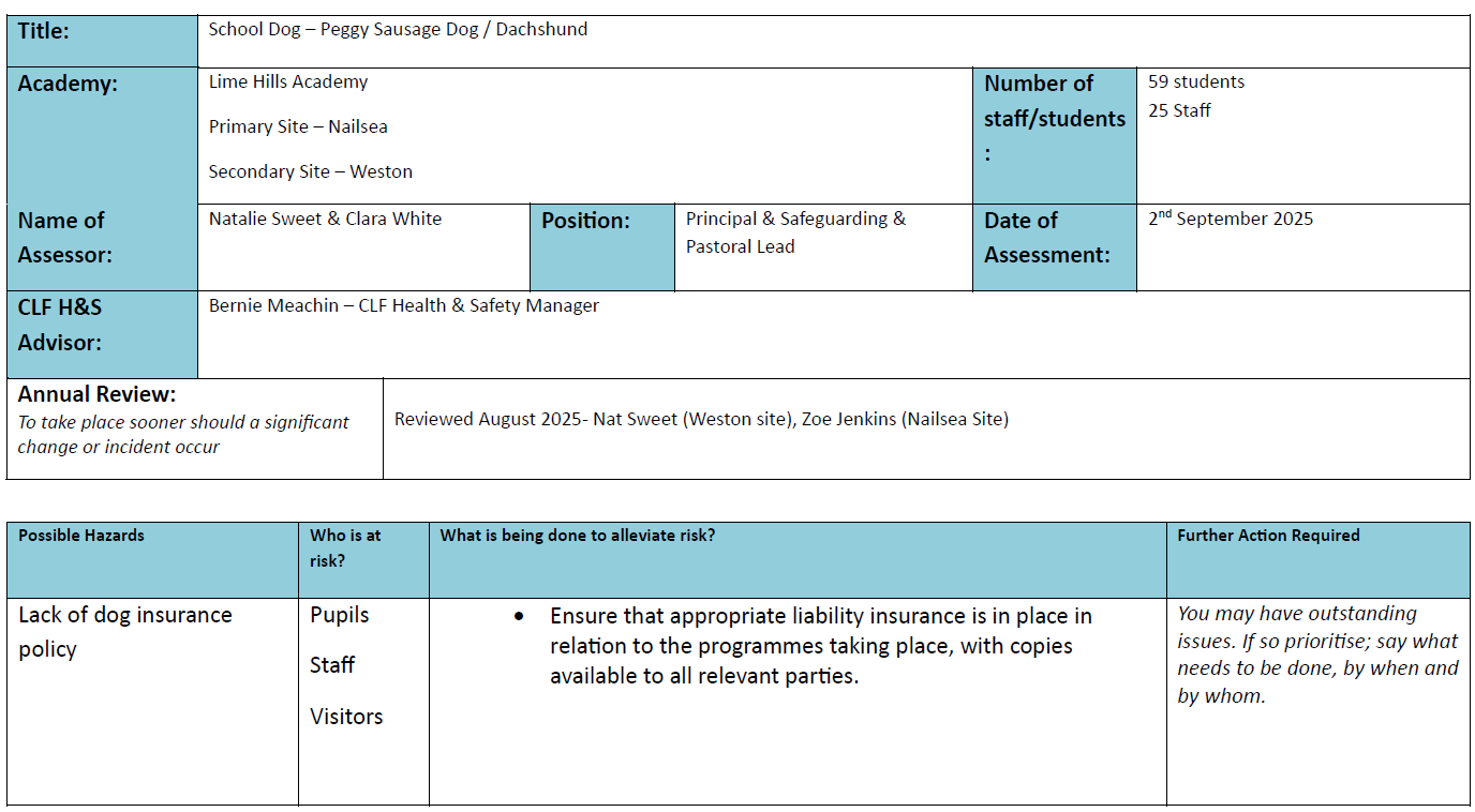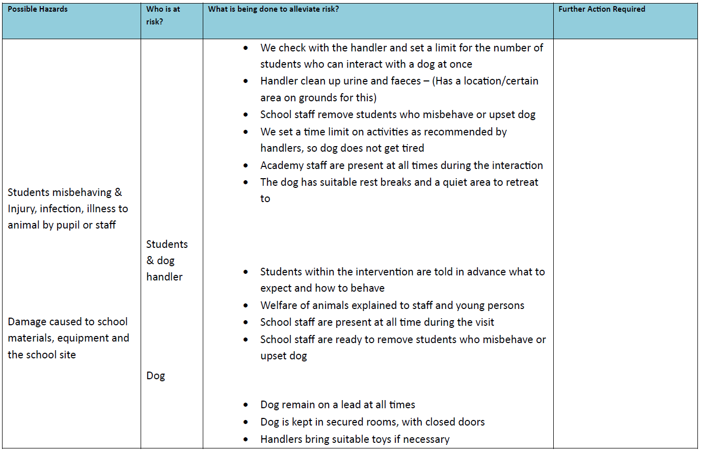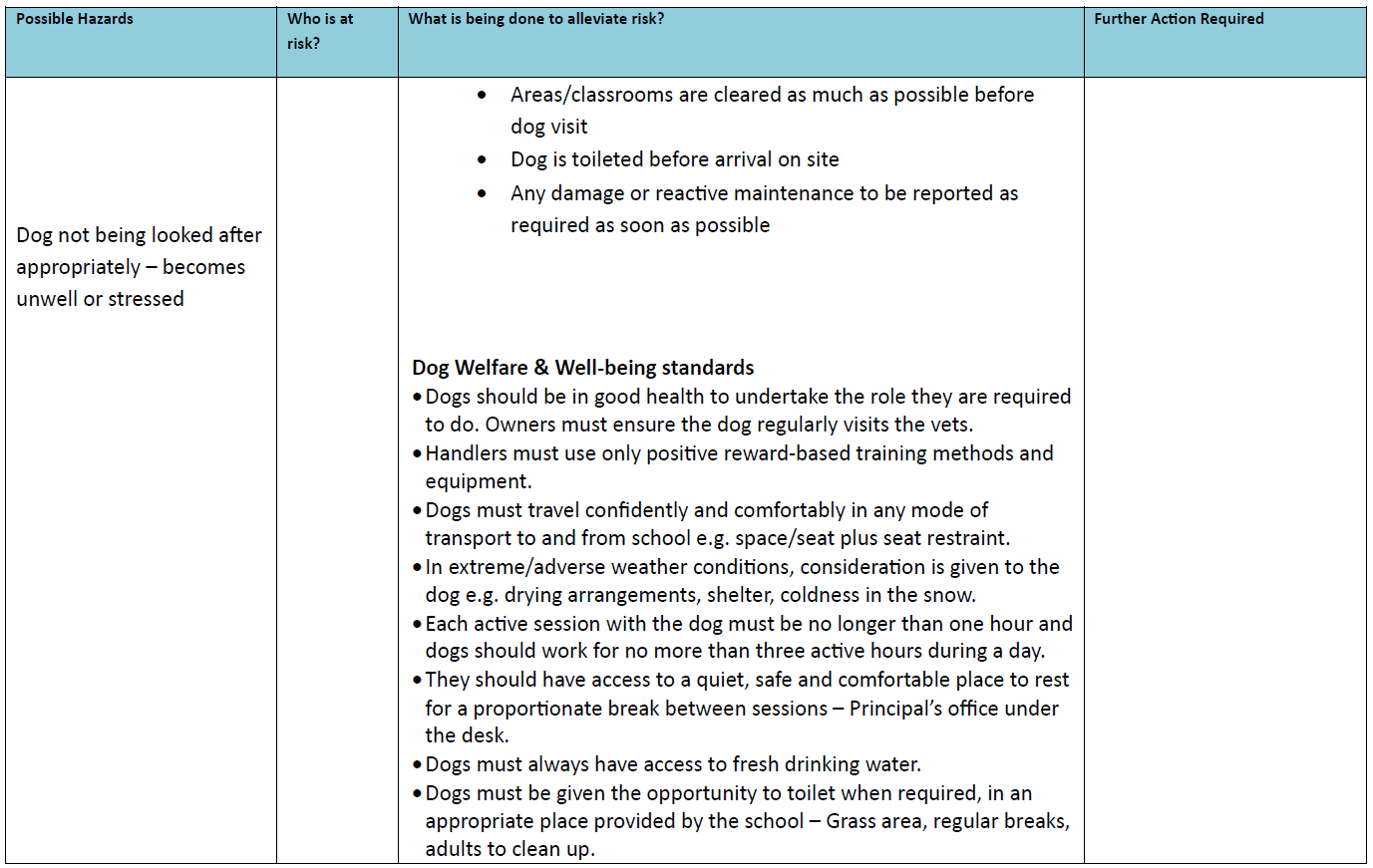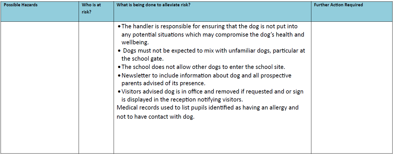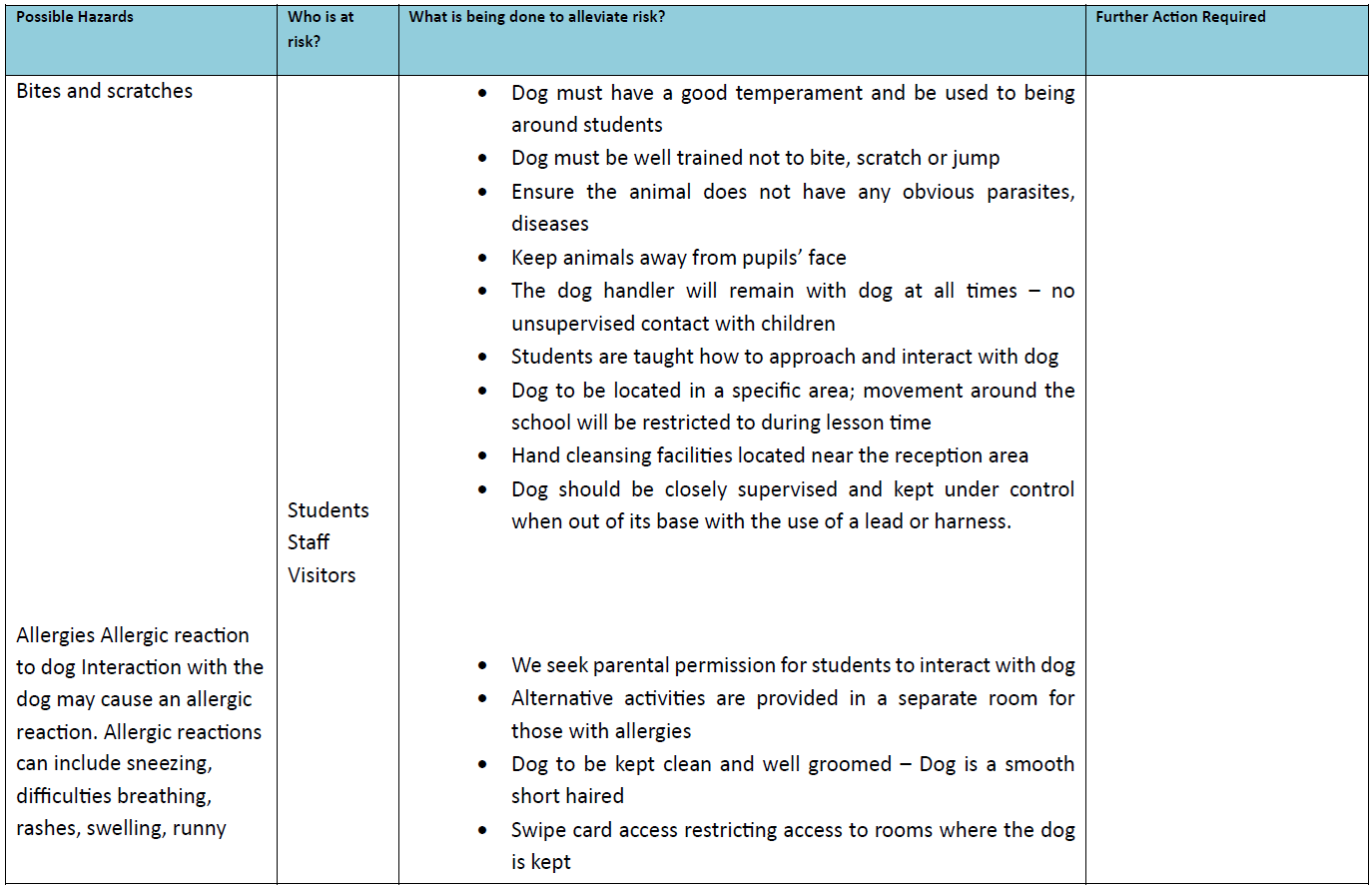There are a variety of accidents that can occur within a school environment on a daily basis and these far exceed the number of injuries or incidents caused by a dog. Therefore, as with any risk, a thorough risk assessment has been carried out and this is included in this document.