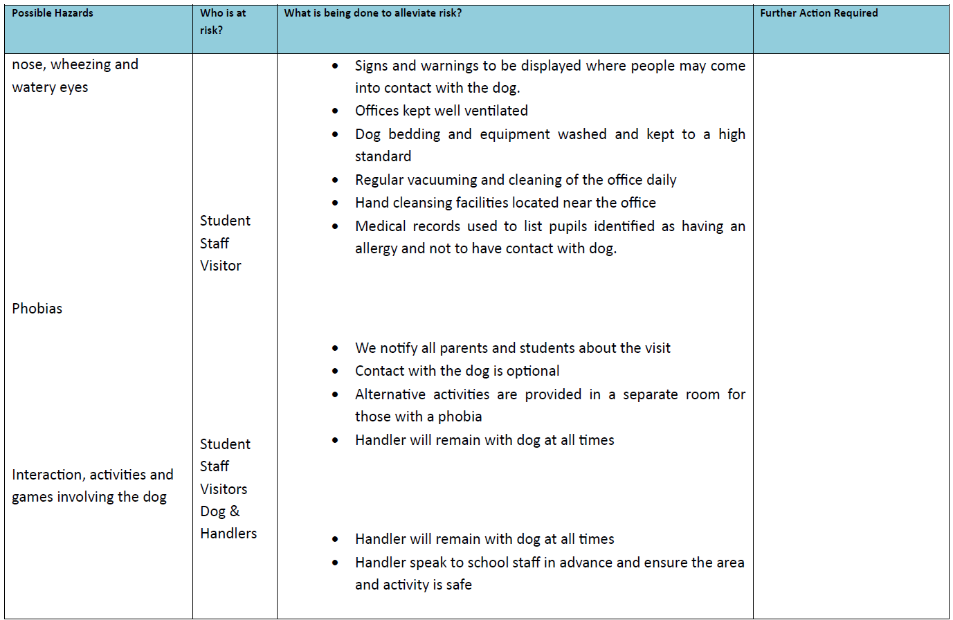 • Staff, visitors and Students known to have allergic reactions to dogs must not go near the dog. All visitors will be informed on arrival that there is a dog in school. The dog will be restricted to very specific areas within the school building.