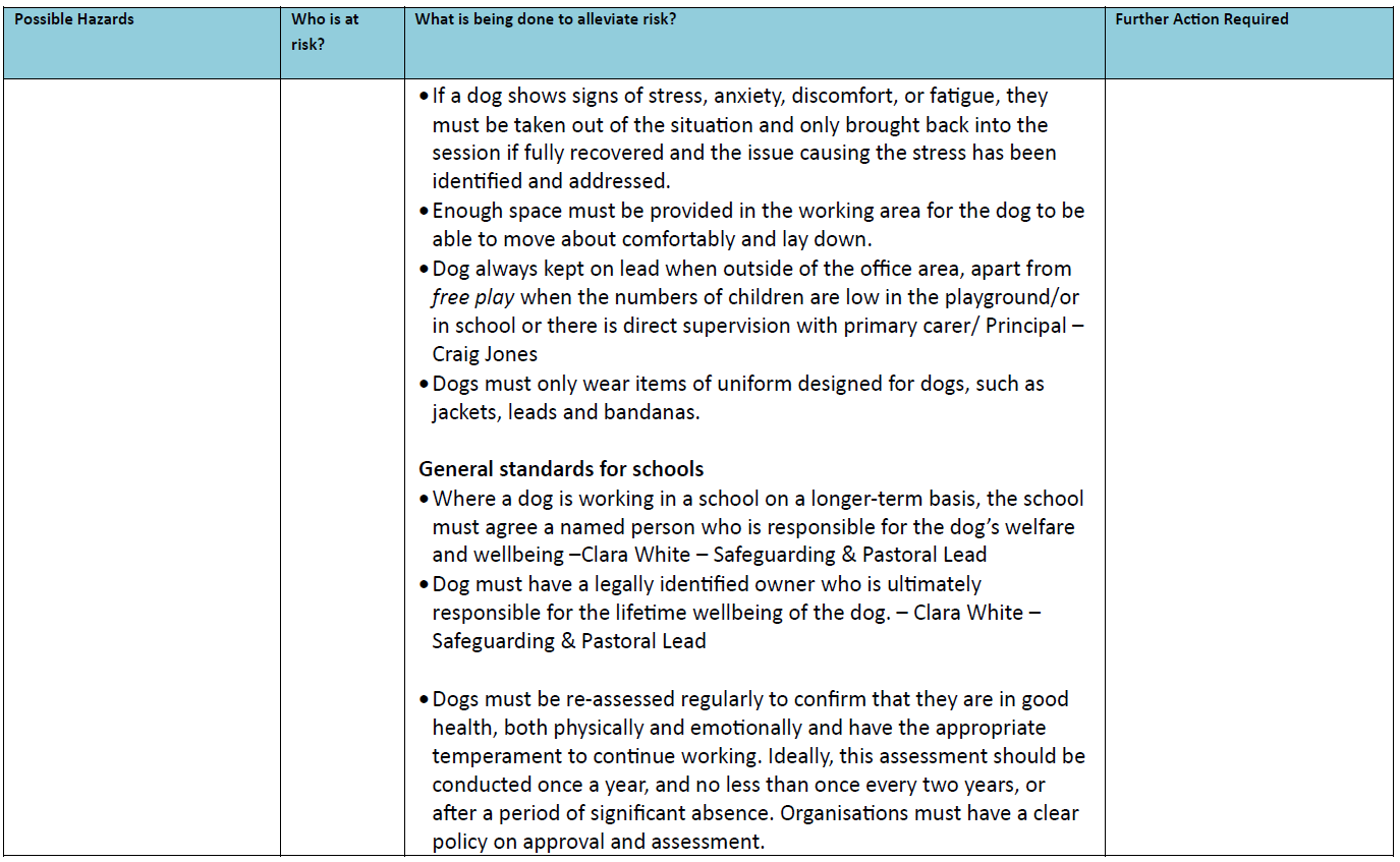 Additionally, there is also the risk of compromised welfare of the dog: the school environment can be a very busy, noisy and unpredictable place; studies suggest that environmental and social stress leads to increased irritability in dogs, increasing the risk of an injury and incident. Therefore, the physical and emotional welfare of the dog will be of the highest priority, as demonstrated in this policy.
